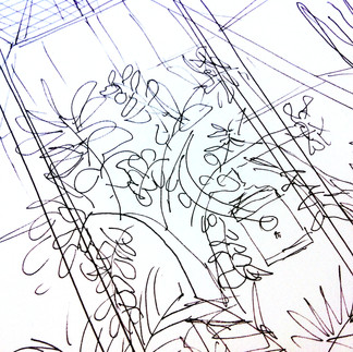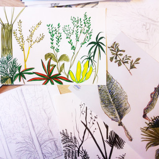 In der Stadtgärtnerei liessen wir unseren Kurs vor der Sommerpause ausklingen und in der Stadtgärtnerei sind wir nun wieder gestartet, diesmal im Palmen- und Tropenhaus. Beginnend mit ganz genauem Beobachten von Blättern, Stämmen und Wurzeln haben wir schrittweise Abstand genommen und die Pflanzen mehr und mehr abstrahiert, schliesslich versucht, nur noch die "Idee" der einzelnen Pflanzen zu skizzieren.